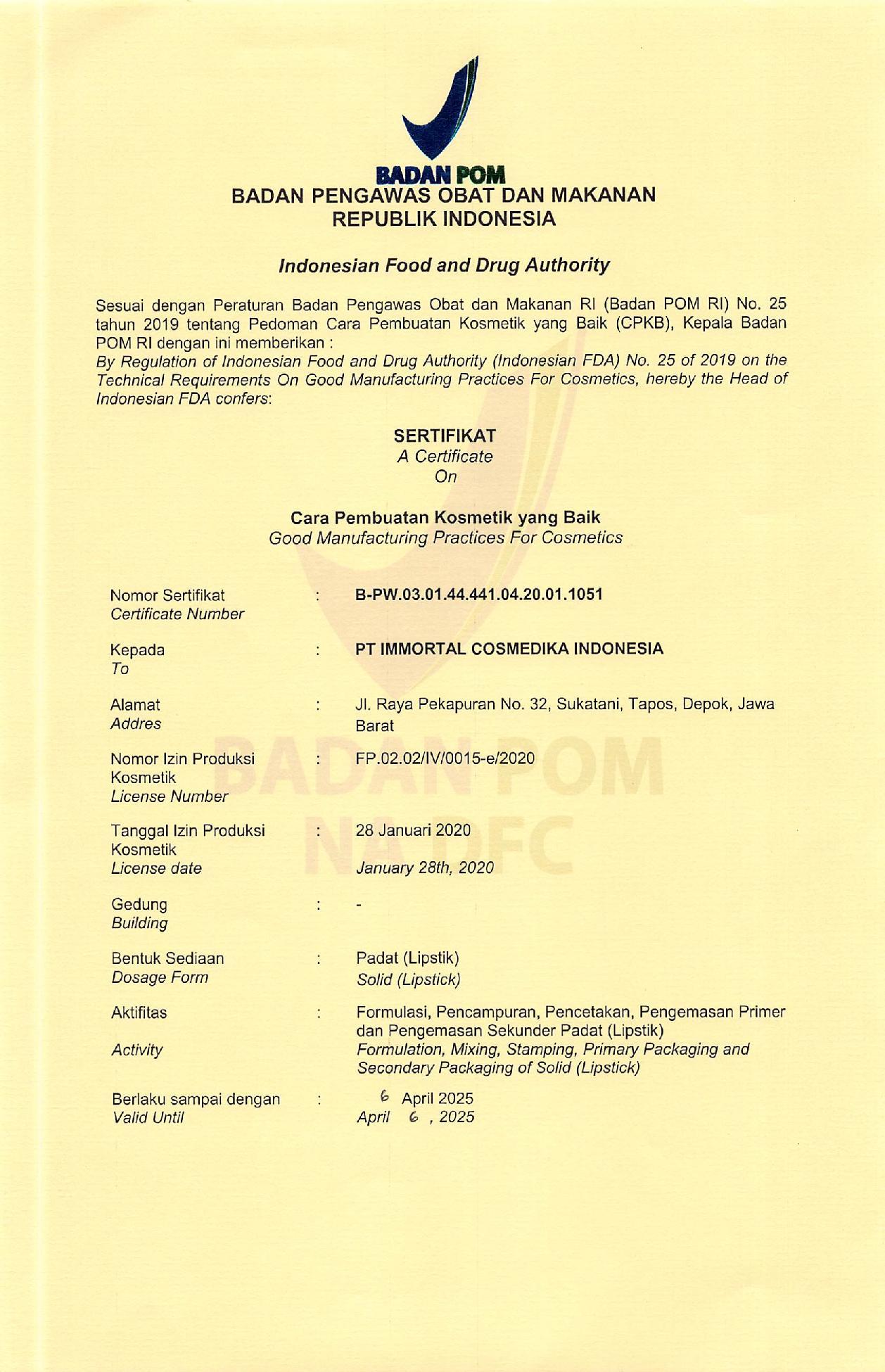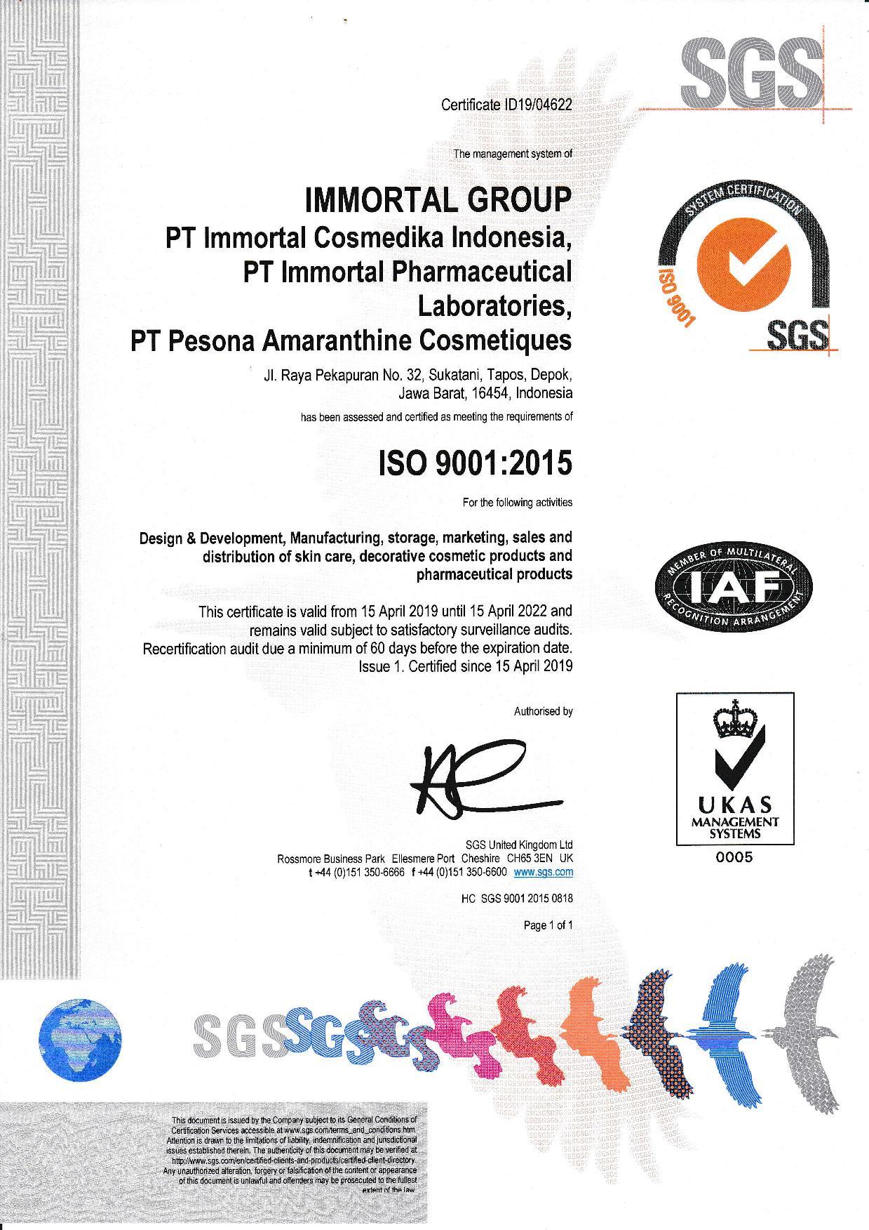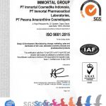 Sertifikasi 2020 Resertifikasi Sistem Jaminan Halal Immortal 2020 Resertifikasi CPKB 2015 Resertifikasi ISO 14001 2015 Resertifikasi ISO 9001 2012 Resertifikasi ISO 22716 GMP Cosmetics 2007 Resertifikasi OHSAS 18001